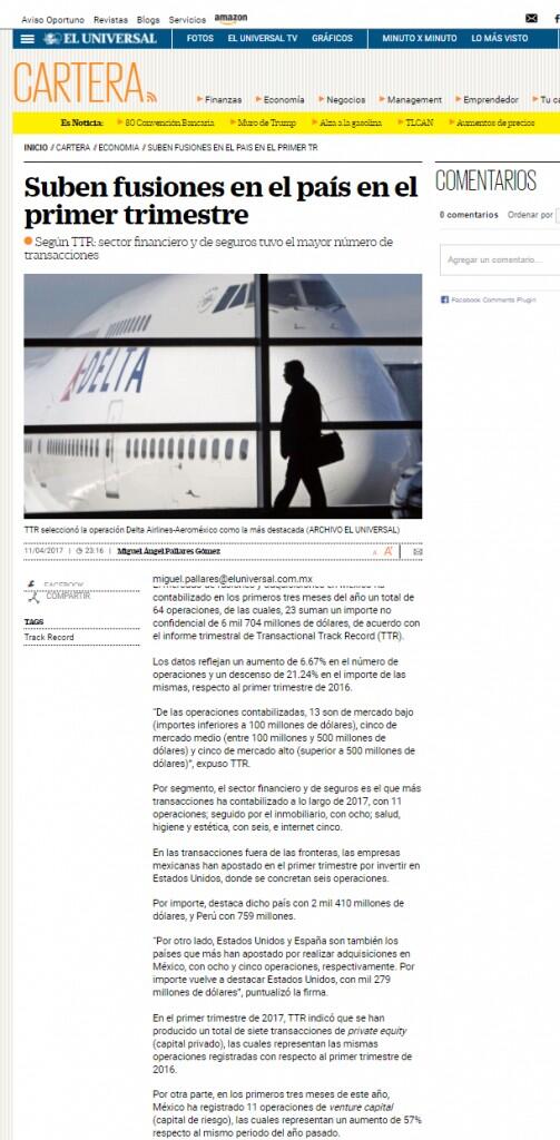 "Para el primer trimestre de 2017, Transactional Track Record ha seleccionado como operación destacada la realizada por Delta Air Lines, en la cual se concluye la OPA sobre el Grupo Aeroméxico", indicó la firma.