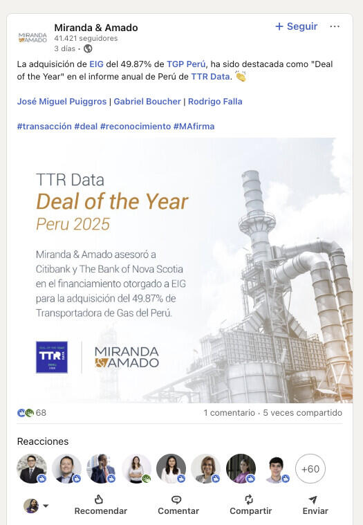 La adquisición de EIG del 49.87% de TGP Perú, ha sido destacada como "Deal of the Year" en el informe anual de Perú de TTR Data. 👏