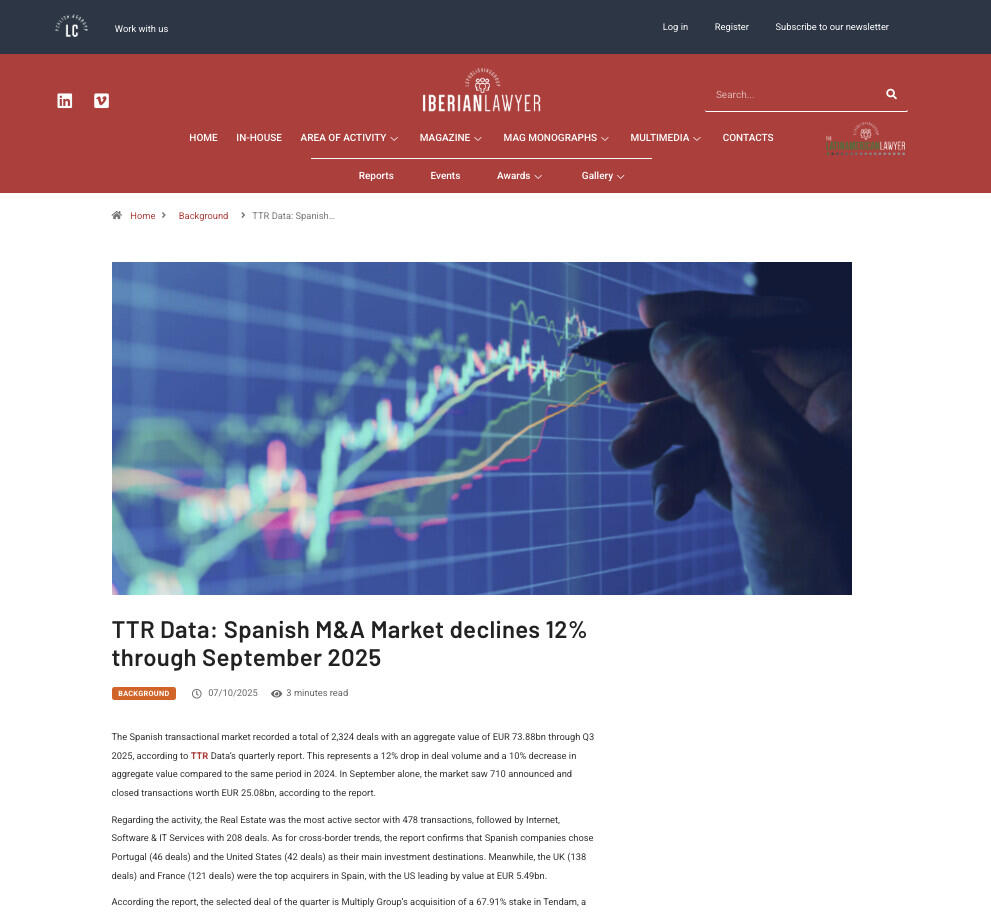 TTR Data: Spanish M&A Market declines 12% through September 2025