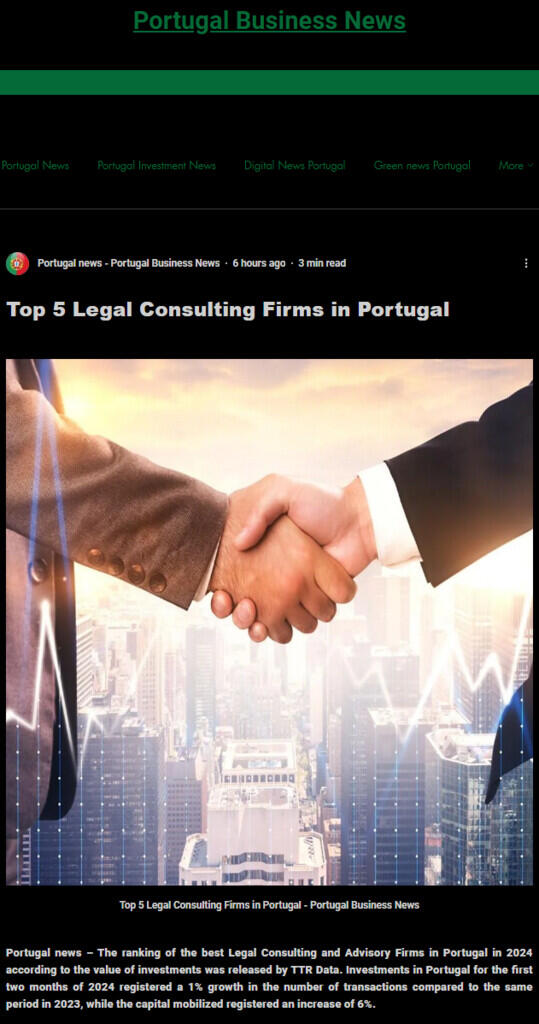 The ranking of the best Legal Consulting and Advisory Firms in Portugal in 2024 according to the value of investments was released by TTR Data. Investments in Portugal for the first two months of 2024 registered a 1% growth in the number of transactions compared to the same period in 2023, while the capital mobilized registered an increase of 6%.
