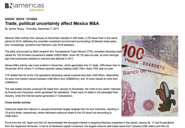 Mexican M&A activity from January to November resulted in 265 deals, 2.2% fewer than in the same period of 2016, reflecting the uncertain investment environment surrounding USMexico trade policy and, increasingly, concerns over Mexico's July 2018 elections.