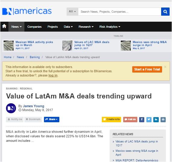 M&A activity in Latin America showed further dynamism in April, when disclosed values for deals soared 223% to US$14.6bn.