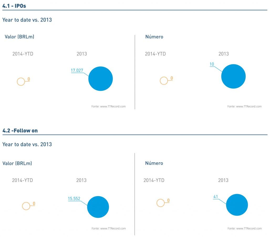 E em relação ao mercado de capitais brasileiro, não foram registradas transações de IPO ou Follow on no primeiro mês do ano. No ano de 2013 foram registrados dez IPOs que movimentaram mais de BRL 17bi.