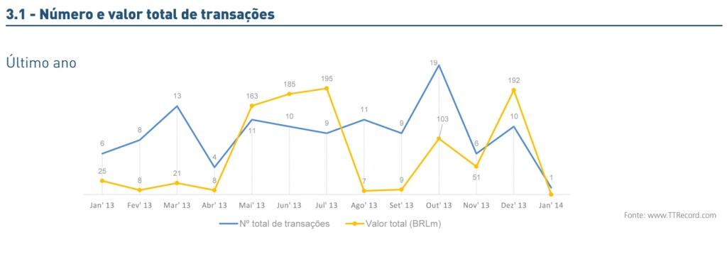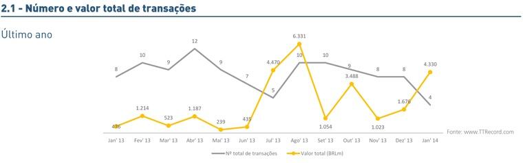 Neste primeiro mês do ano o mercado transacional brasileiro registrou 50 transações, entre anunciadas e concluídas, frente as 64 que foram registradas em janeiro de 2013. O valor total movimentado foi de