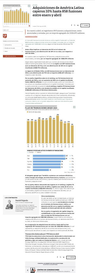 Según datos registrados hasta abril, por número de transacciones, Brasil lidera el ranking de países más activos de la región con 537 transacciones (con un descenso de 1%) y con una disminución de 25% en el capital movilizado (US$9.770 millones).