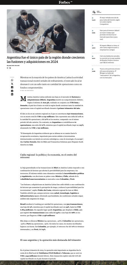"El desempeño de Argentina evidencia que se afianza en su camino hacia la recuperación económica, importante para enviar señales a inversionistas internacionales con interés en sectores estratégicos, como la tecnología y la energía", dijo Carlos Dorado, líder de M&A and Transaction Solutions para Hispanic South America en Aon.