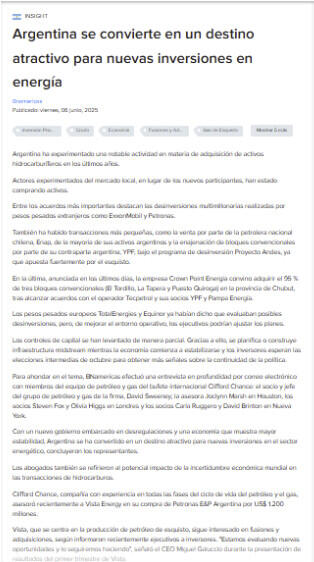 También ha habido transacciones más pequeñas, como una por parte de la petrolera nacional YPF en la formación Vaca Muerta, que representan una tendencia clara: las compañías internacionales se están replegando de Argentina. YPF, bajo el paraguas de la denominada Proyecto Andes, ya adquirió activos de Petronas.