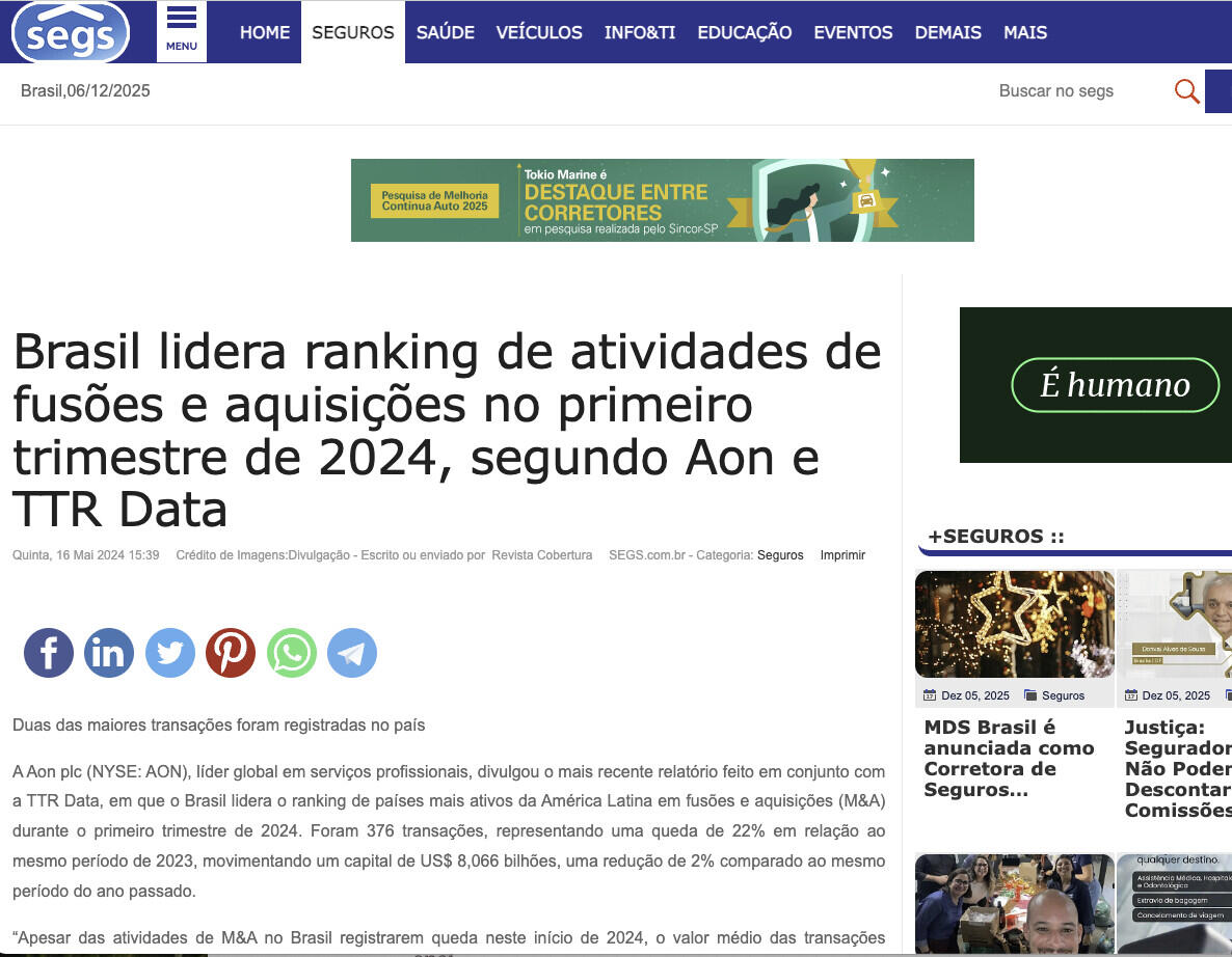 Para mais informações do primeiro relatório trimestral de 2024 sobre fusões e aquisições na América Latina, realizado pela TTR Data e Aon, clique aqui.