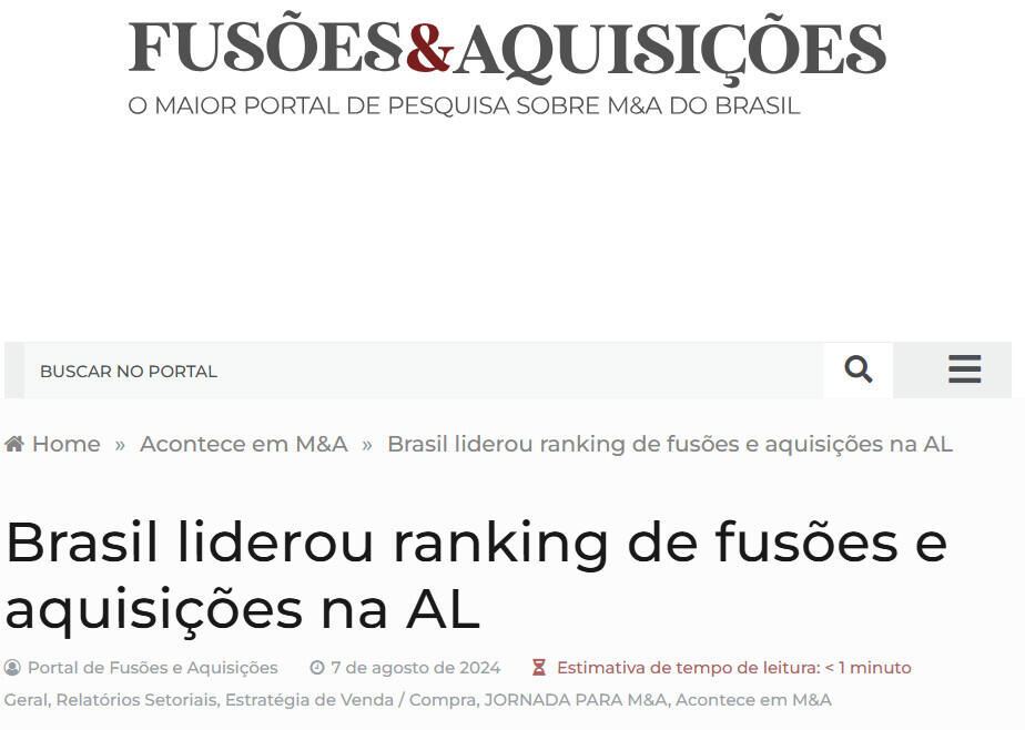 No primeiro semestre de 2024, o Brasil liderou o ranking de países mais ativos da América Latina em fusões e aquisições (M&A). Foram registradas 747 transações nos primeiros seis meses, uma queda de 27% em relação ao mesmo período de 2023. Para as 365 transações que tiveram seu valor revelado, o capital mobilizado foi de aproximadamente US$ 20 bilhões, uma redução de 3% comparado ao primeiro semestre do ano anterior. Os números foram divulgados nesta terça-feira pela Aon plc ,líder global em serviços profissionais. O relatório foi feito em conjunto com a TTR Data.