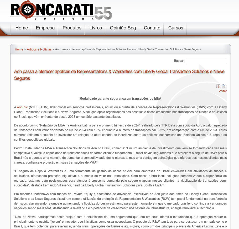 Buscar: Aon passa a oferecer apólices de Representations & Warranties com Liberty Global Transaction Solutions e Newe Seguros