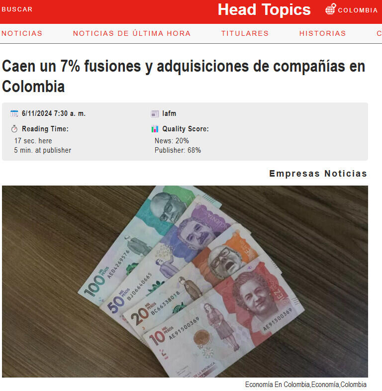 Un informe elaborado por Aon plc y TTR Data reveló que las fusiones y adquisiciones han caído un 7% en Colombia este año, con un total de 192 operaciones registradas. El valor de estas transacciones también cayó un 14%, alcanzando los USD2.868 millones.Estados Unidos continúa siendo el principal inversor en Colombia , con 43 transacciones que suman 733.23 millones de dólares. Le siguen España, con 17 operaciones valoradas en USD175.