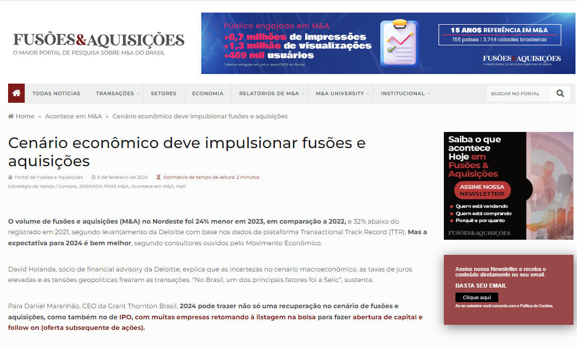 Para Daniel Maranhão, CEO da Grant Thornton Brasil, 2024 pode trazer não só uma recuperação no cenário de fusões e aquisições, como também no de IPO, com muitas empresas retomando à listagem na bolsa para fazer abertura de capital e follow on (oferta subsequente de ações).