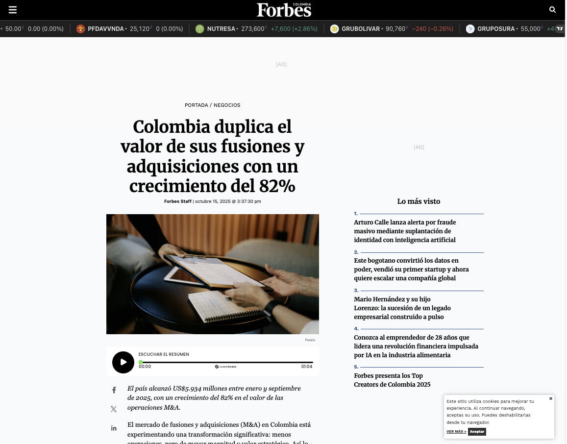 Colombia duplica el valor de sus fusiones y adquisiciones con un crecimiento del 82%