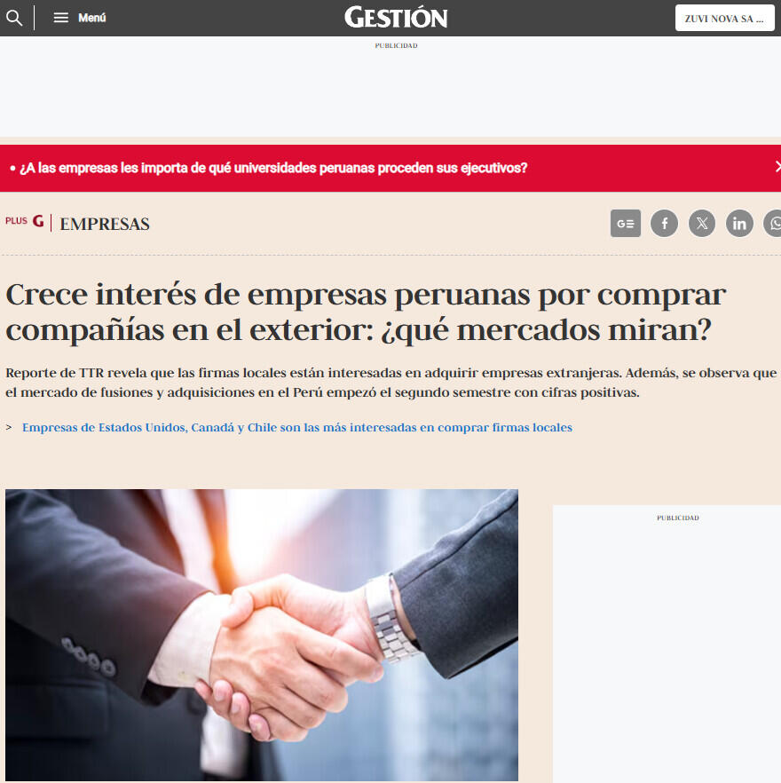 Reporte de TTR revela que las firmas locales están interesadas en adquirir empresas extranjeras. Además, se observa que el mercado de fusiones y adquisiciones en el Perú empezó el segundo semestre con cifras positivas.