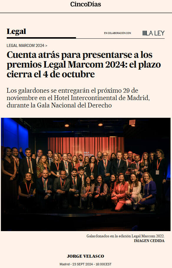 Comienza la cuenta atrás para presentar la candidatura de los premios Legal Marcom 2024. Las firmas legales que quieran presentarse a este reconocido premio tendrán hasta el próximo 4 de octubre para inscribir su solicitud a través de la página web: legalmarcom.com. Los galardones se entregarán el 29 de noviembre en el Hotel Intercontinental de Madrid, durante la Gala Nacional del Derecho en el que Gericó Associates, organizador del evento, contará entre otros con Aranzadi LA LEY como mediapartner de la ceremonia.