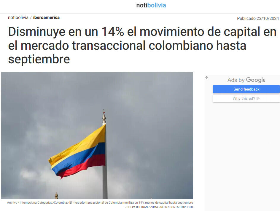 Disminuye en un 14% el movimiento de capital en el mercado transaccional colombiano hasta septiembre
