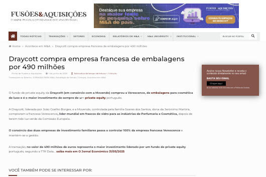 A Draycott, liderada por João Coelho Borges, e a Movendo, controlada pela família Soares dos Santos, dona da Jerónimo Martins, compraram a francesa Verescence, líder mundial em frascos de vidro para as indústrias de Perfumaria e Cosmética, depois de terem tido luz verde da Comissão Europeia.