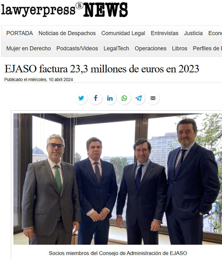 Ejaso, despacho especializado en la abogacía de los negocios para el middle market, ha alcanzado los 23,3 millones de euros de facturación en 2023, un 7,4% más que el año anterior, cuando llegaron a los 21,7 millones de euros. La firma ha duplicado su cifra de negocio en tan solo 7 años.