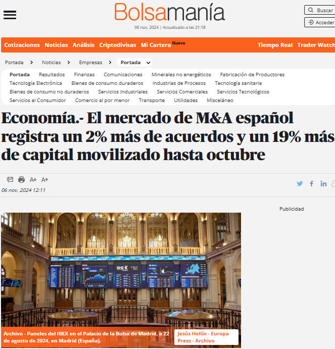 Economía.- El mercado de M&A español registra un 2% más de acuerdos y un 19% más de capital movilizado hasta octubre