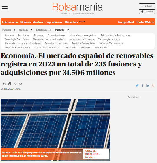 Economía.-El mercado español de renovables registra en 2023 un total de 235 fusiones y adquisiciones por 31.506 millones
