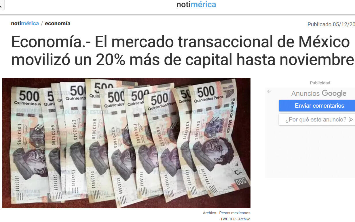 Economía.- El mercado transaccional de México movilizó un 20% más de capital hasta noviembre