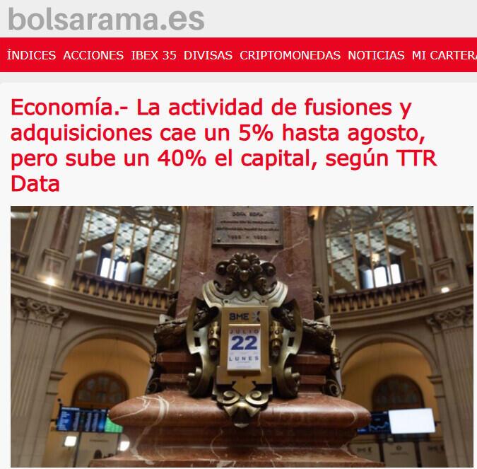 Economía.- La actividad de fusiones y adquisiciones cae un 5% hasta agosto, pero sube un 40% el capital, según TTR Data