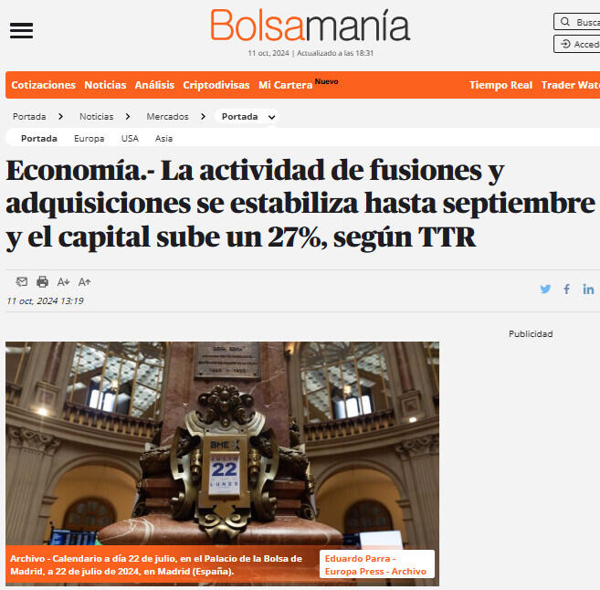 El mercado transaccional español ha registrado hasta septiembre un total de 2.319 acuerdos de fusiones y adquisiciones, lo que supone un inapreciable descenso del 0,04% respecto al mismo periodo de 2023, aunque, por contra, el importe de estas adquisiciones en lo que va de año ha sido de 74.700 millones de euros, un 27% más del capital movilizado en los nueve primeros meses de 2023, según el informe divulgado este viernes por TTR Data.