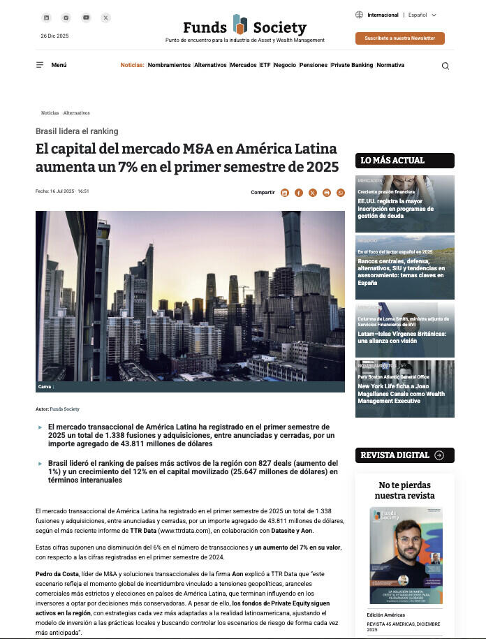 Para el primer semestre de 2025, TTR Data ha seleccionado como transacción destacada la adquisición por Prosus, entidad dedicada a operar en el sector de internet con sede en ÁmsterdamPaíses Bajos, del 100% de Despegar.com por aproximadamente 1.700 millones de dólares, mediante la fusión de la empresa con una filial de Prosus.