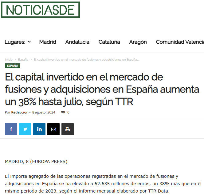 El importe agregado de las operaciones registradas en el mercado de fusiones y adquisiciones en España se ha elevado a 62.635 millones de euros, un 38% más que en el mismo periodo de 2023, según el informe mensual elaborado por TTR Data.