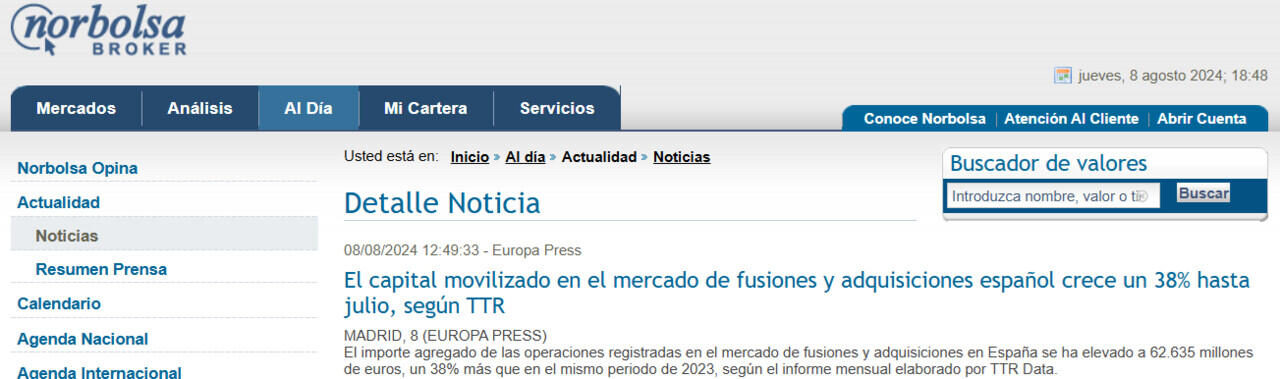 El importe agregado de las operaciones registradas en el mercado de fusiones y adquisiciones en España se ha elevado a 62.635 millones de euros, un 38% más que en el mismo periodo de 2023, según el informe mensual elaborado por TTR Data.