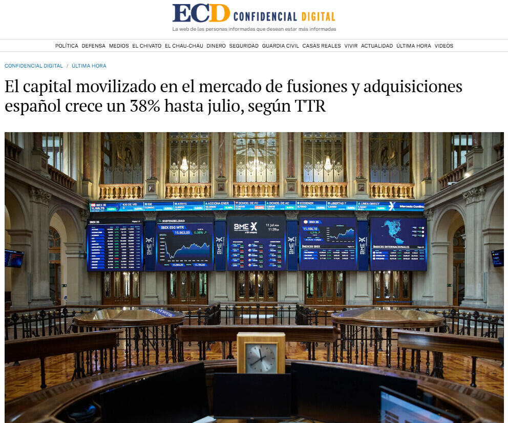 El capital movilizado en el mercado de fusiones y adquisiciones español crece un 38% hasta julio, según TTR