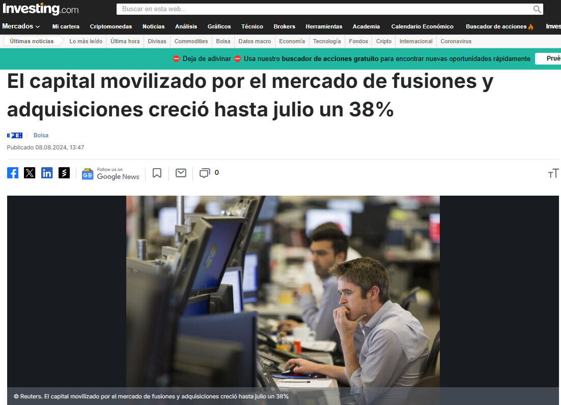 El capital movilizado por el mercado de fusiones y adquisiciones creció hasta julio un 38%