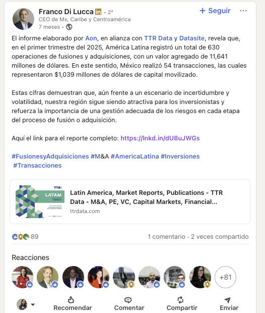 El informe elaborado por Aon, en alianza con TTR Data y Datasite, revela que, en el primer trimestre del 2025, América Latina registró un total de 630 operaciones de fusiones y adquisiciones, con un valor agregado de 11,641 millones de dólares. En este sentido, México realizó 54 transacciones, las cuales representaron $1,039 millones de dólares de capital movilizado.