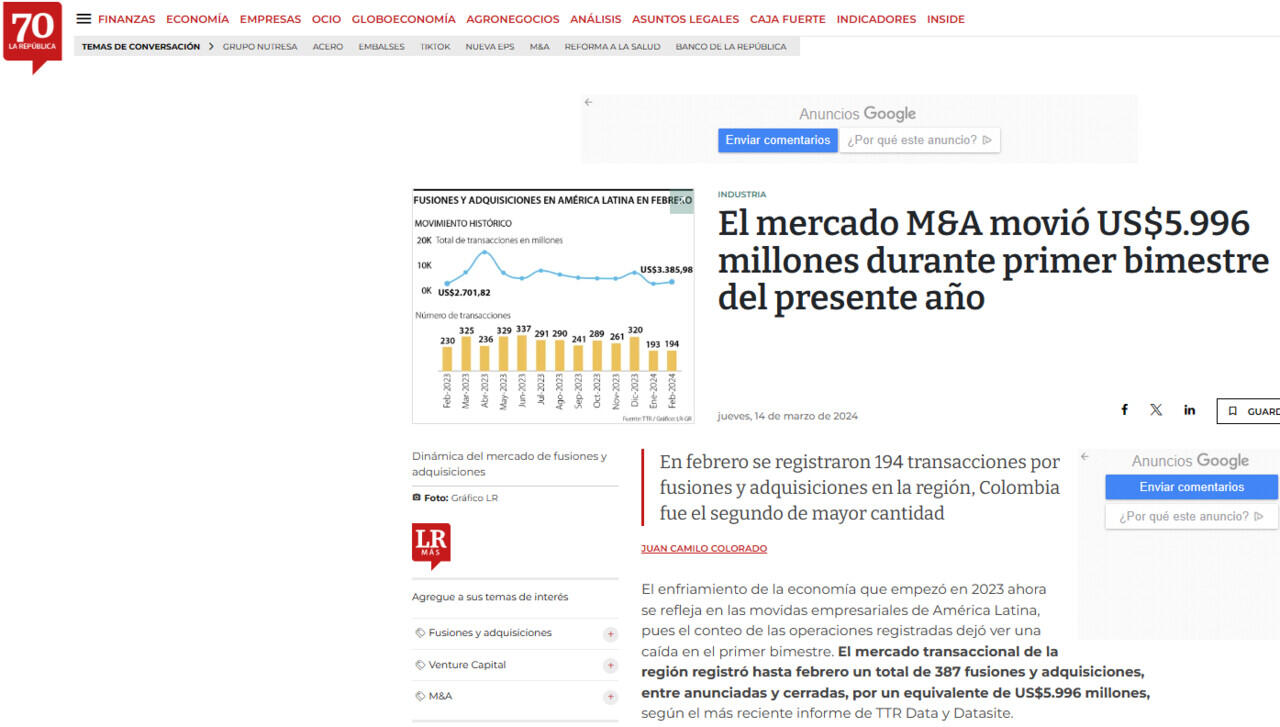 En febrero se registraron 194 transacciones por fusiones y adquisiciones en la región, Colombia fue el segundo de mayor cantidad