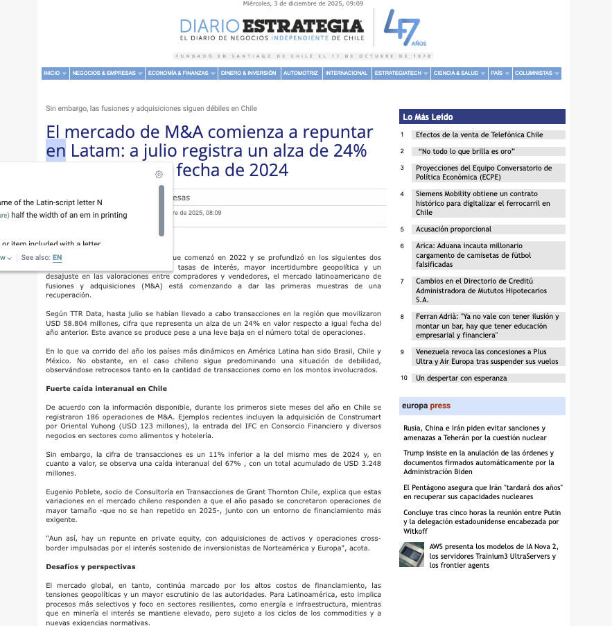 En Chile, a este panorama se suman algunos temas regulatorios que han influido en la confianza. Con todo, "el mercado se ha mantenido activo, pero con una clara brecha entre el número de transacciones y el valor movilizado, lo que podría ser un indicio de un menor tamaño promedio de los deals", señala Eugenio Poblete.