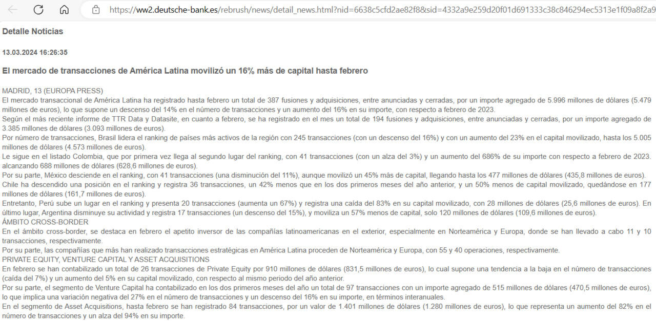 Le sigue en el listado Colombia, que por primera vez llega al segundo lugar del ranking, con 41 transacciones (con un alza del 3%) y un aumento del 686% de su importe con respecto a febrero de 2023. alcanzando 688 millones de dólares (628,6 millones de euros).