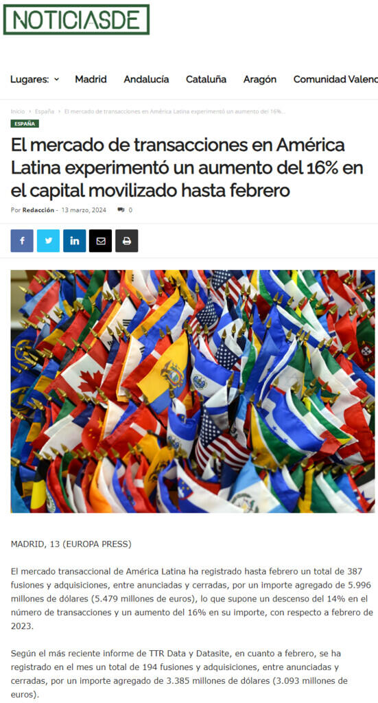 l mercado transaccional de América Latina ha registrado hasta febrero un total de 387 fusiones y adquisiciones, entre anunciadas y cerradas, por un importe agregado de 5.996 millones de dólares (5.479 millones de euros), lo que supone un descenso del 14% en el número de transacciones y un aumento del 16% en su importe, con respecto a febrero de 2023.