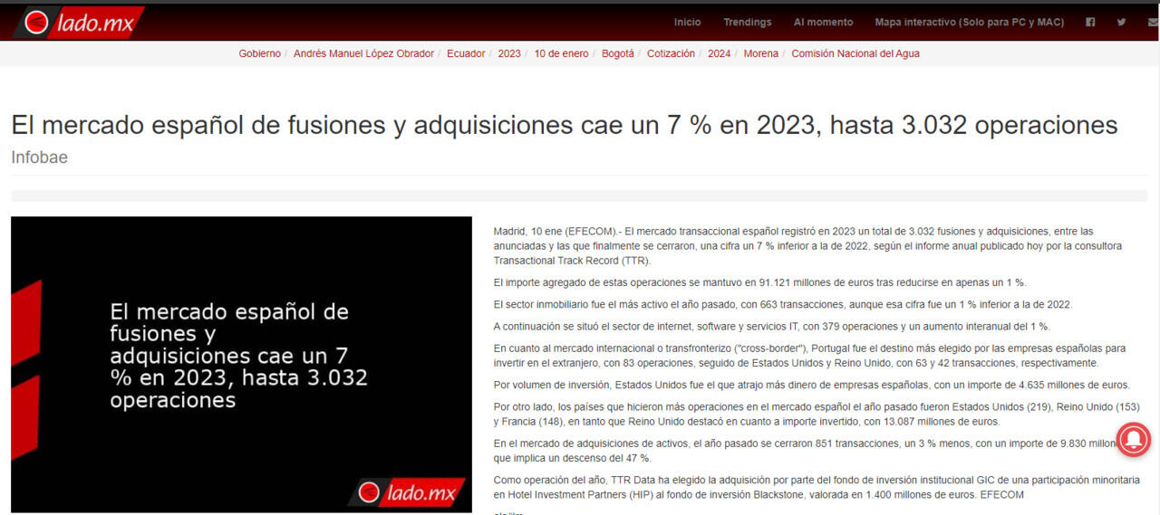 Madrid, 10 ene (EFECOM).- El mercado transaccional español registró en 2023 un total de 3.032 fusiones y adquisiciones, entre las anunciadas y las que finalmente se cerraron, una cifra un 7 % inferior a la de 2022, según el informe anual publicado hoy por la consultora Transactional Track Record (TTR).