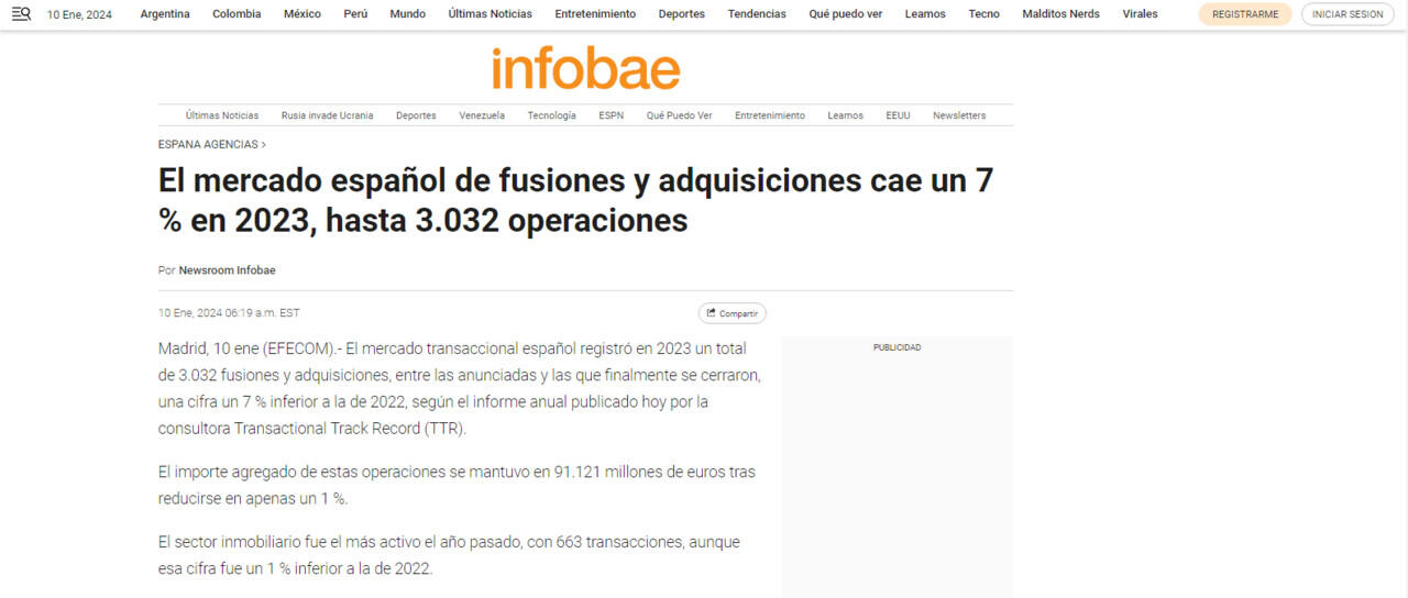 Madrid, 10 ene (EFECOM).- El mercado transaccional español registró en 2023 un total de 3.032 fusiones y adquisiciones, entre las anunciadas y las que finalmente se cerraron, una cifra un 7 % inferior a la de 2022, según el informe anual publicado hoy por la consultora Transactional Track Record (TTR).