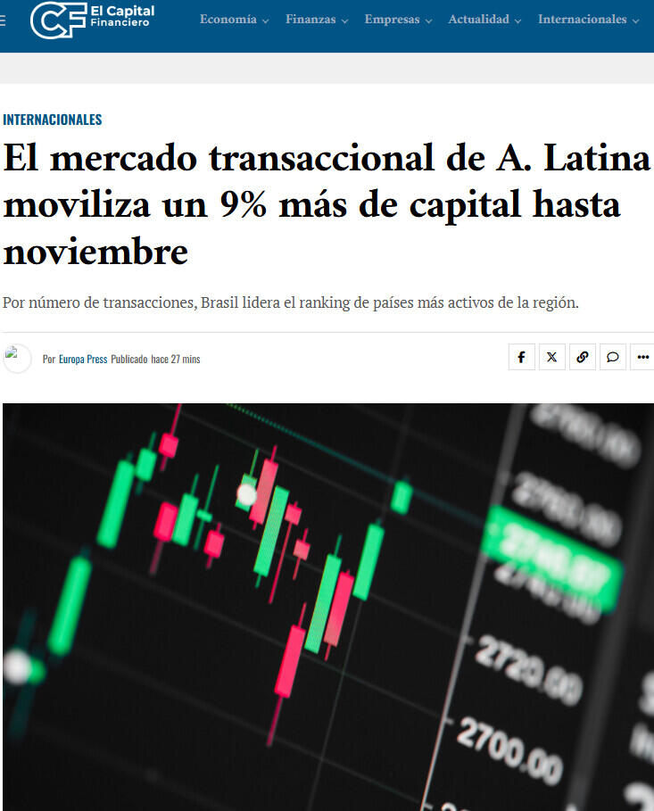 El mercado transaccional de A. Latina moviliza un 9% más de capital hasta noviembre