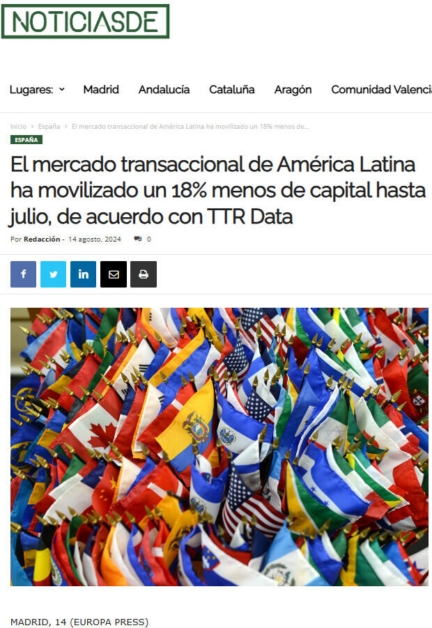 El mercado transaccional de América Latina ha movilizado un 18% menos de capital hasta julio, de acuerdo con TTR Data