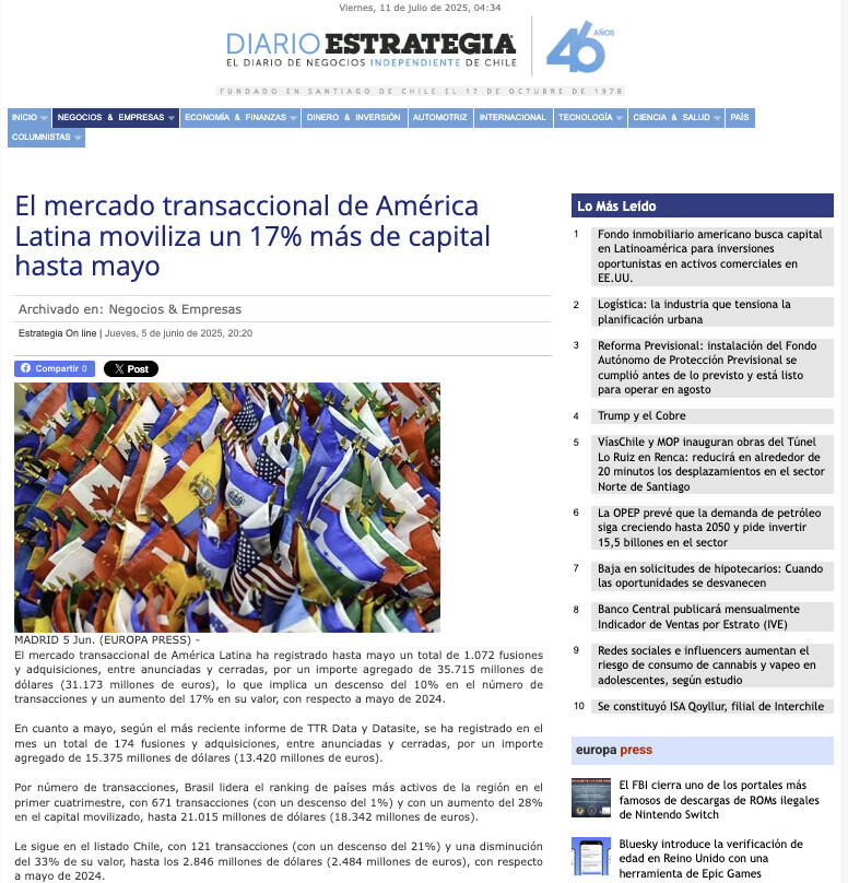 El mercado transaccional de América Latina moviliza un 17% más de capital hasta mayo