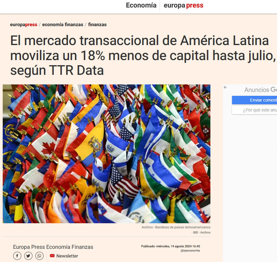 El mercado transaccional de América Latina moviliza un 18% menos de capital hasta julio, según TTR Data