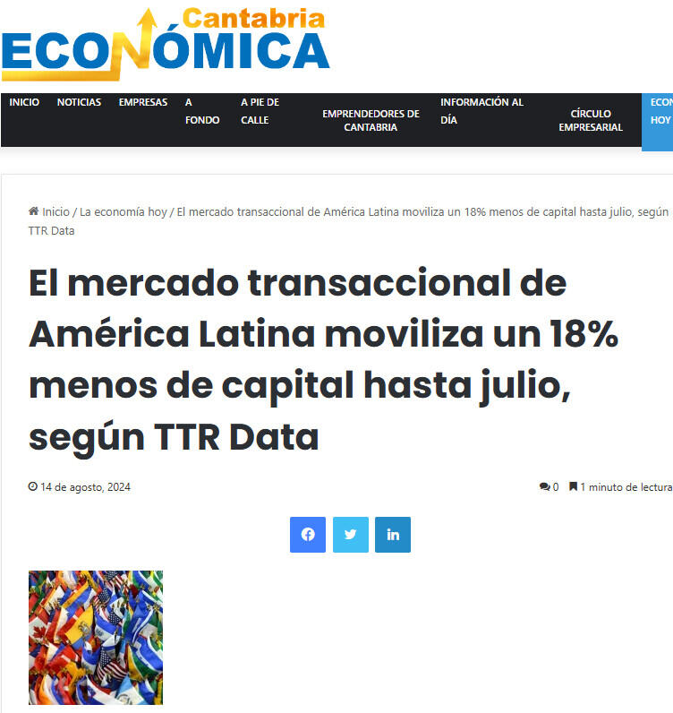 El mercado transaccional de América Latina moviliza un 18% menos de capital hasta julio, según TTR Data