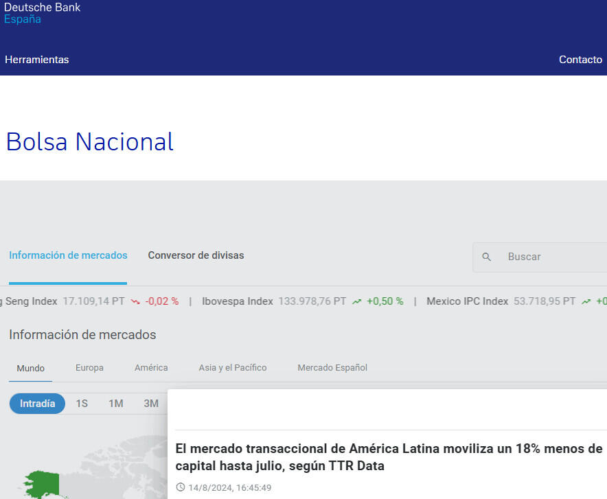 El mercado transaccional de América Latina moviliza un 18% menos de capital hasta julio, según TTR Data