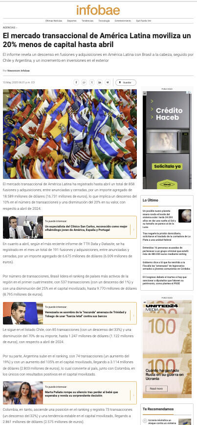 El mercado transaccional de América Latina ha registrado hasta abril un total de 858 fusiones y adquisiciones, entre anunciadas y cerradas, por un importe agregado de 18.589 millones de dólares (16.731 millones de euros), lo que implica un descenso del 10% en el número de transacciones y una disminución del 20% en su valor, con respecto a abril de 2024.