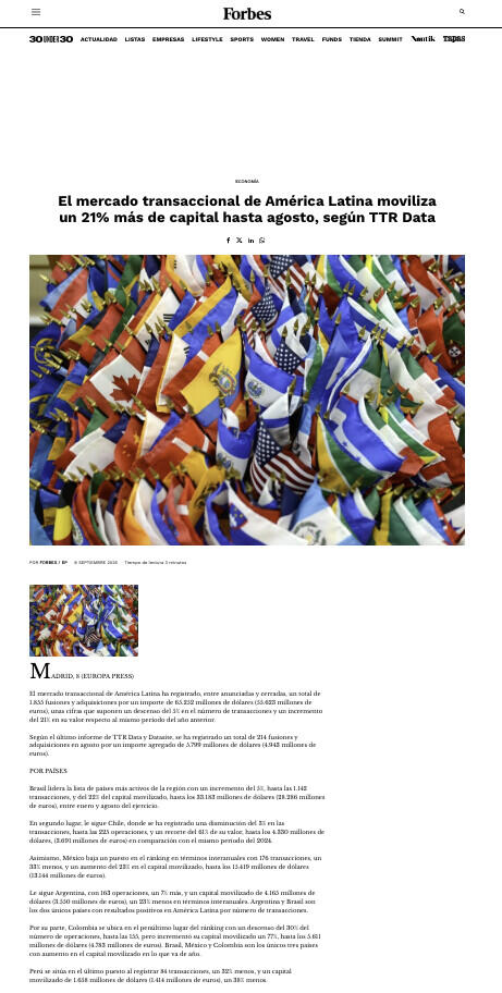 El mercado transaccional de América Latina moviliza un 21% más de capital hasta agosto, según TTR Data