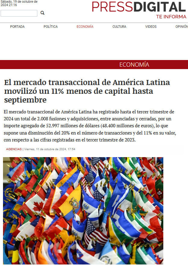 El mercado transaccional de América Latina movilizó un 11% menos de capital hasta septiembre