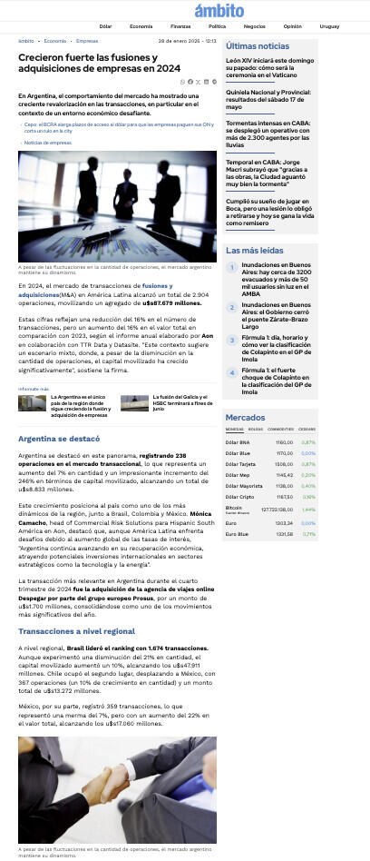 El mercado argentino registra 238 fusiones y adquisiciones en 2024, destacando la industria de software y un incremento notable en las inversiones provenientes de Estados Unidos y Brasil