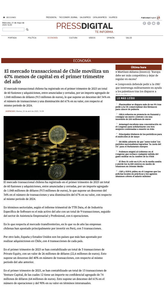 El mercado transaccional chileno ha registrado en el primer trimestre de 2025 un total de 60 fusiones y adquisiciones, entre anunciadas y cerradas, por un importe agregado de 1.048 millones de dólares (913 millones de euros), lo que supone un descenso del 34% en el número de transacciones y una disminución del 67% en su valor, con respecto al mismo periodo de 2024.